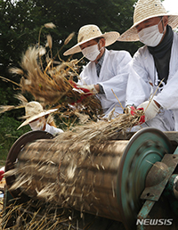 ソウル市瑞草区を流れる良才川そばのオーガニック麦畑で29日、良才川の管理者たちが収穫した麦を脱穀した。