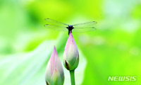 【NEWSIS】27日午後、慶尚南道河東郡のハス畑で、つぼみにトンボが1匹、とまっていた。