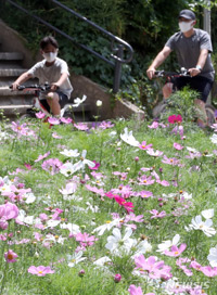 【NEWSIS】30℃前後の気温になるとの予報が出た27日午前、ソウル市松坡区内の城内川沿いにコスモスが咲いていた。