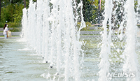 青空の広がるさわやかな天気となった26日、全羅北道全州市の全北大学では、キャンパス内にある噴水台を訪れた市民が涼しげな水流の間の散策を楽しんでいた。