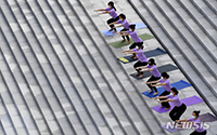 【NEWSIS】21日、釜山市金井区の釜山外国語大学広場で、「2021国際ヨガの日フェスティバル」が行われた。写真はフェスティバルに参加してポーズをするヨガ・インストラクターたちのデモンストレーショ..
