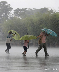 ソウル市竜山区の国立中央博物館で22日午後、突然のにわか雨で、傘を持って走っていく市民の様子。