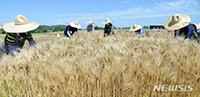 二十四節気の9番目に当たる「芒種(ぼうしゅ)」を翌日に控えた4日、全羅北道完州郡の農村振興庁国立食料科学院では、関係者が玉の汗を流しつつムギの収穫を行っていた。