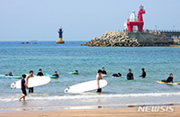 韓国各地で暑い天気となった7日午後、済州市の梨湖海水浴場でサーフィンを学ぶレジャー客の様子。