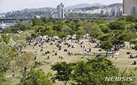 【NEWSIS】日曜日だった2日午後、ソウル・汝矣島の漢江公園で、外出を楽しむ人々。政府は3日から現行の「社会的距離確保(防疫段階)」(首都圏第2段階、それ以外は1.5段階)と、直系家族以外の5人以..