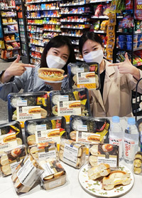 【NEWSIS】18日、ソウル市城東区のコンビニエンスストア「Eマート24」聖水大宇店で、プレミアム食事代用パン「シグネチャー・オリジナル・ホットドッグ」と「ベーグル・サンドイッチ」2種のPRが行わ..