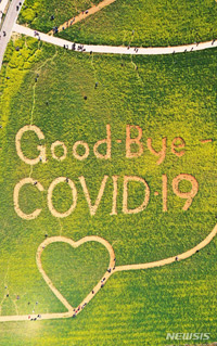 【NEWSIS】春の日差しが暖かかった18日午後、京畿道安城市内の安城ファームランドを訪れた人々。「GoodBye COVID-19(グッバイ 新型コロナ)」と書かれた菜の花畑を歩いていた。