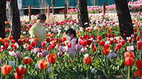 15日、慶尚南道咸陽郡馬川面の咸陽生態体験場を訪れた子どもたちが、色も形もさまざまな花を咲かせたチューリップを眺めて楽しい一時を過ごしている様子。