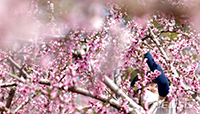 のどかな春の天気となった9日、世宗市鳥致院邑のモモ農家で、満開のモモの花を見つめる関係者の様子。